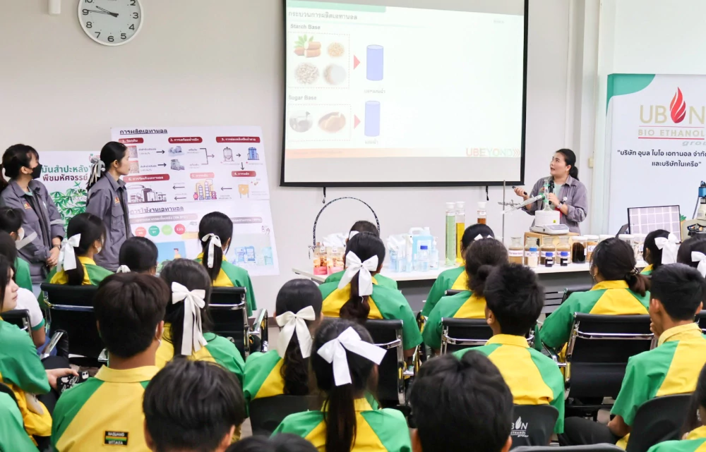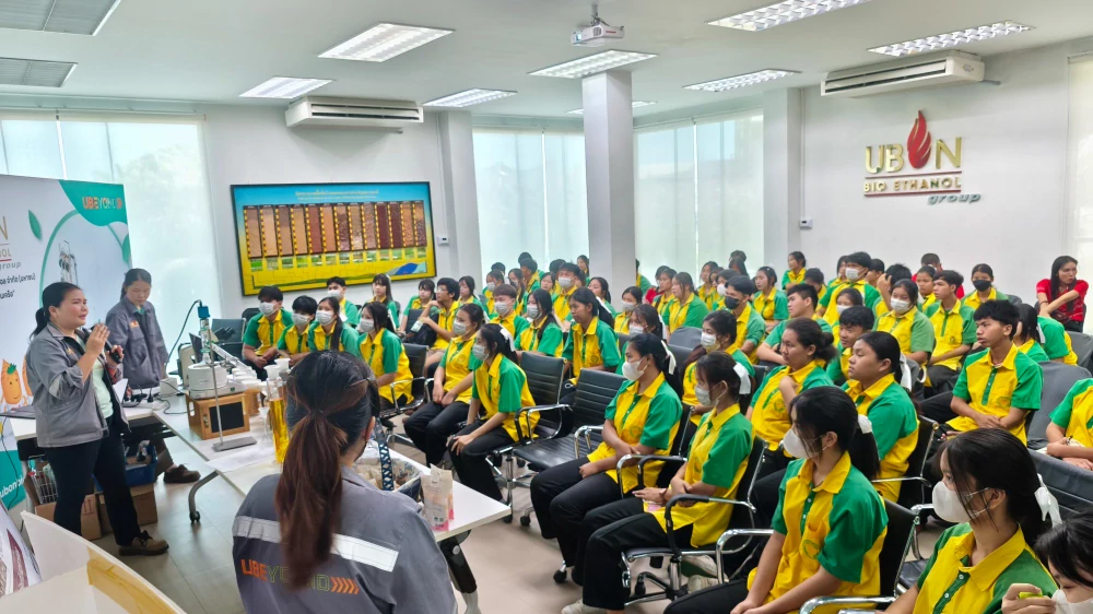 On 18 February 2026, Ubon Bio Ethanol Public Company Limited and its affiliated companies under “UBE GROUP,” led by Ms. Kochaporn Choosriwas, Section Manager of Quality Control, Standards Systems, and Testing Laboratory, together with the quality analyst team and corporate management representatives, welcomed teachers and 88 Grade 11 students from Nasawang Wittaya School, Nasawang Subdistrict, Det Udom District, Ubon Ratchathani Province, as part of the “Young Chemists Camp” program.